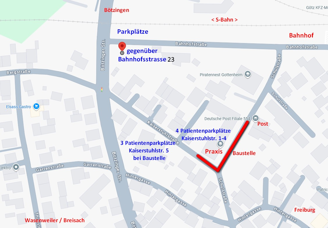 PARKEN Patientenparkplätze Luftaufnahme Parkplätze für Patienten (Kaiserstuhlstrasse 1- 5) Alternative Parkplätze, wenn Sie sonst nichts finden (3min zu Fuß von Praxis, Bahnhofstr. 23) |